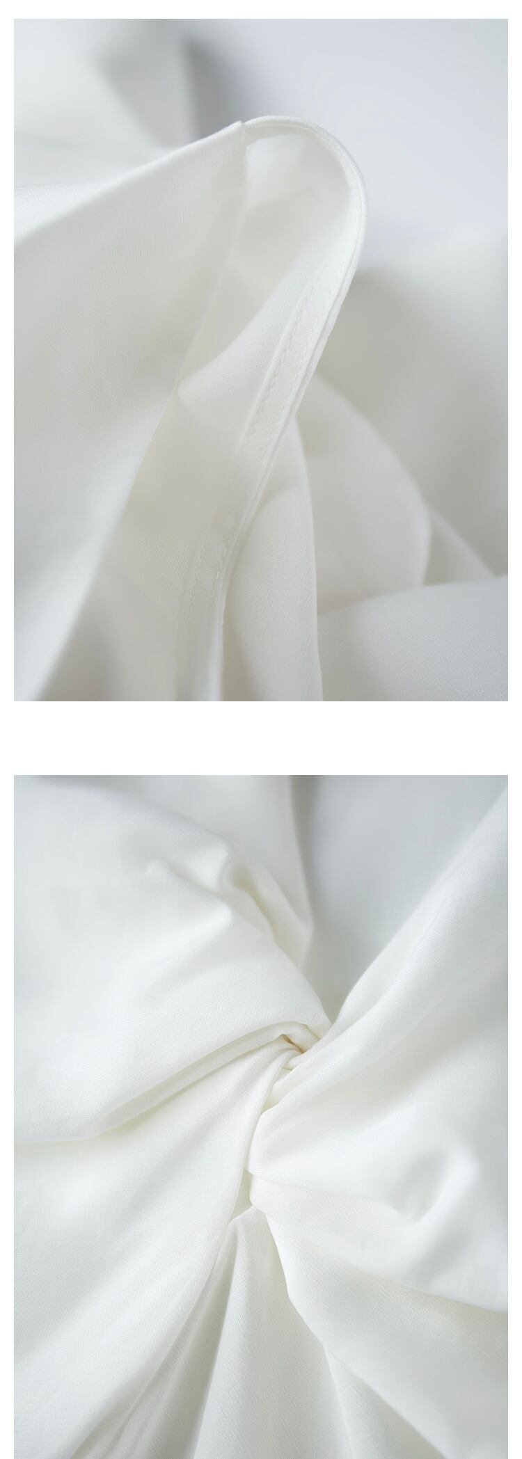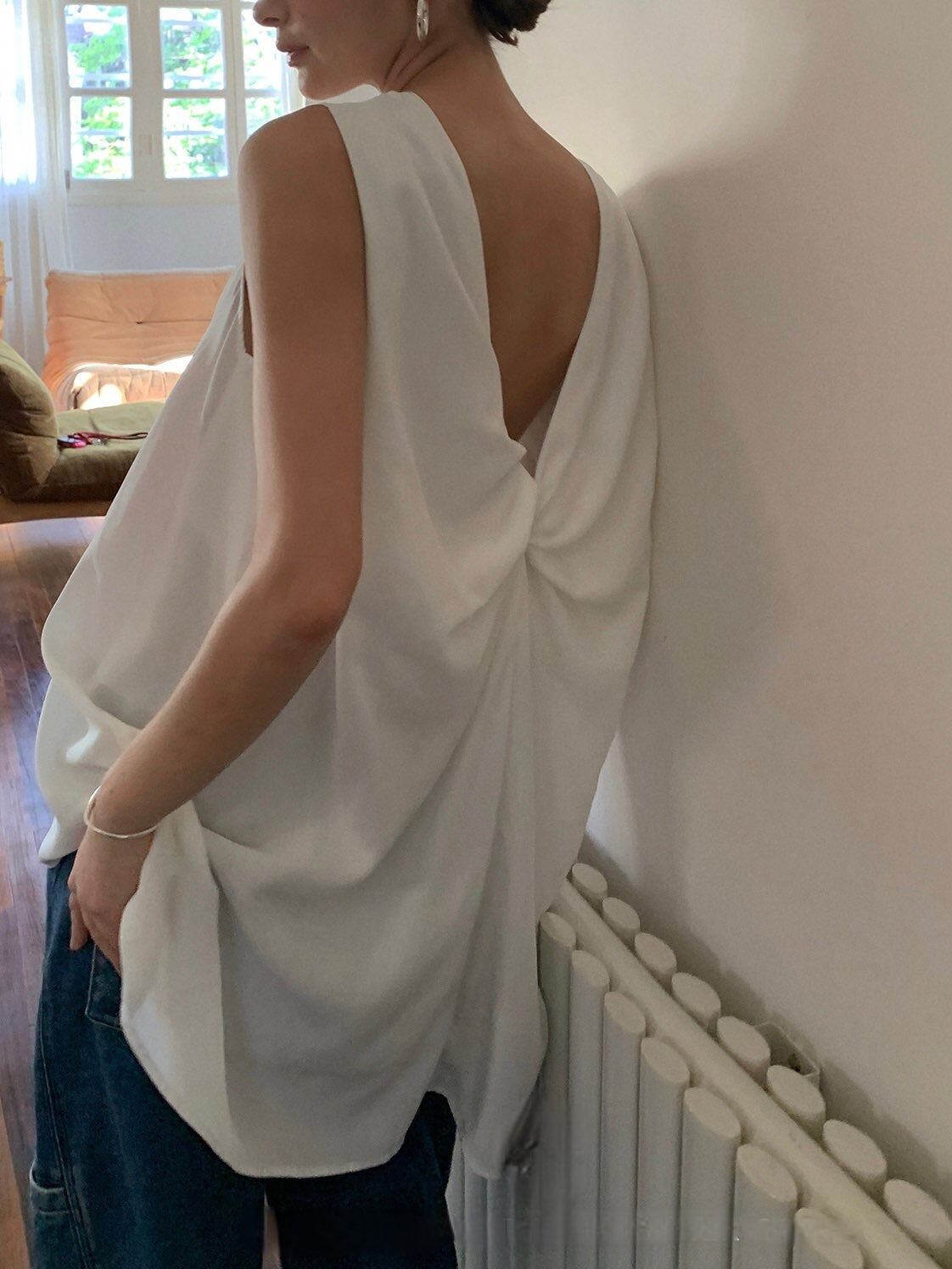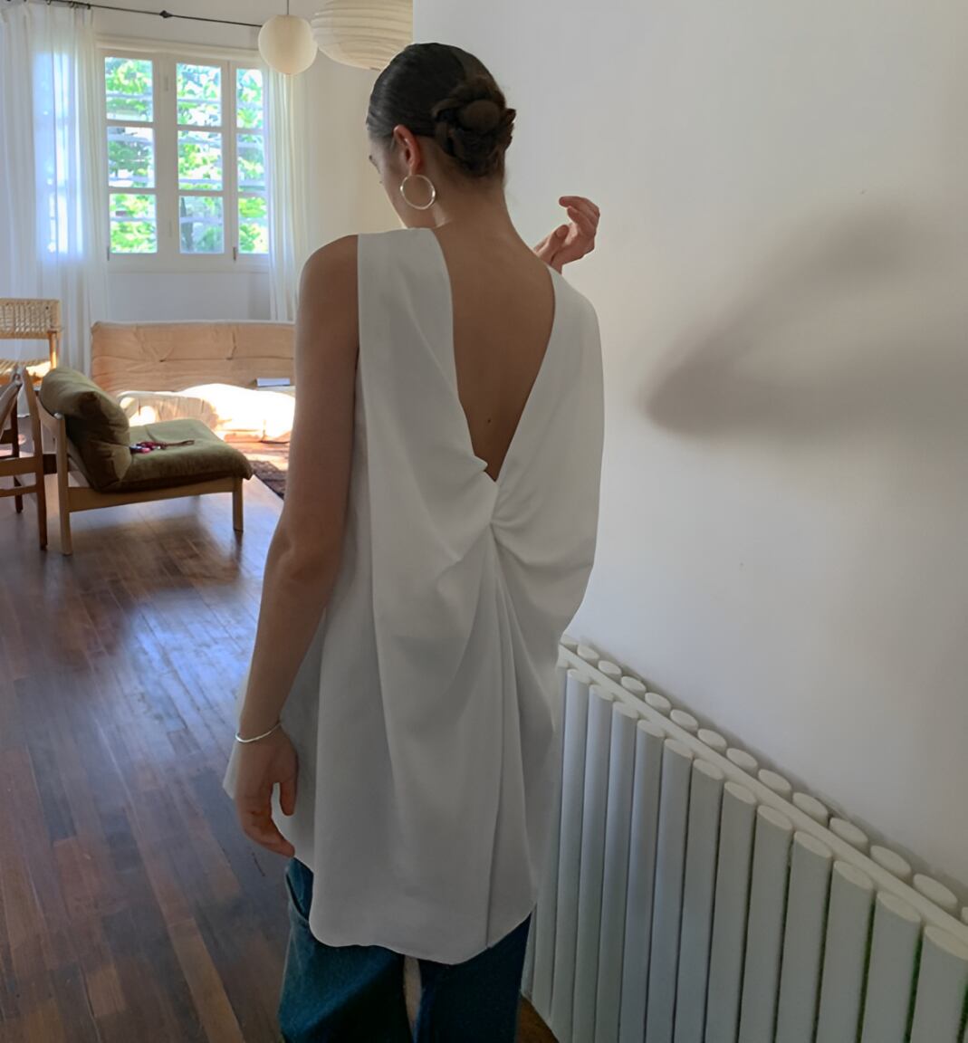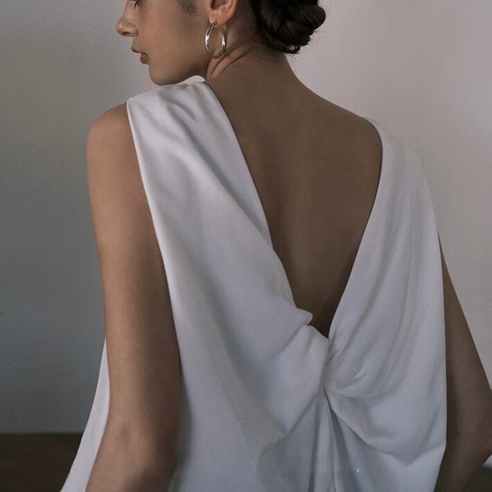 後ろでタイを結んで着るスリーブレストップスが登場しました。ラウンドネックで華奢な肩紐が女性らしい印象を演出し、後ろ姿もおしゃれに引き立ちます。