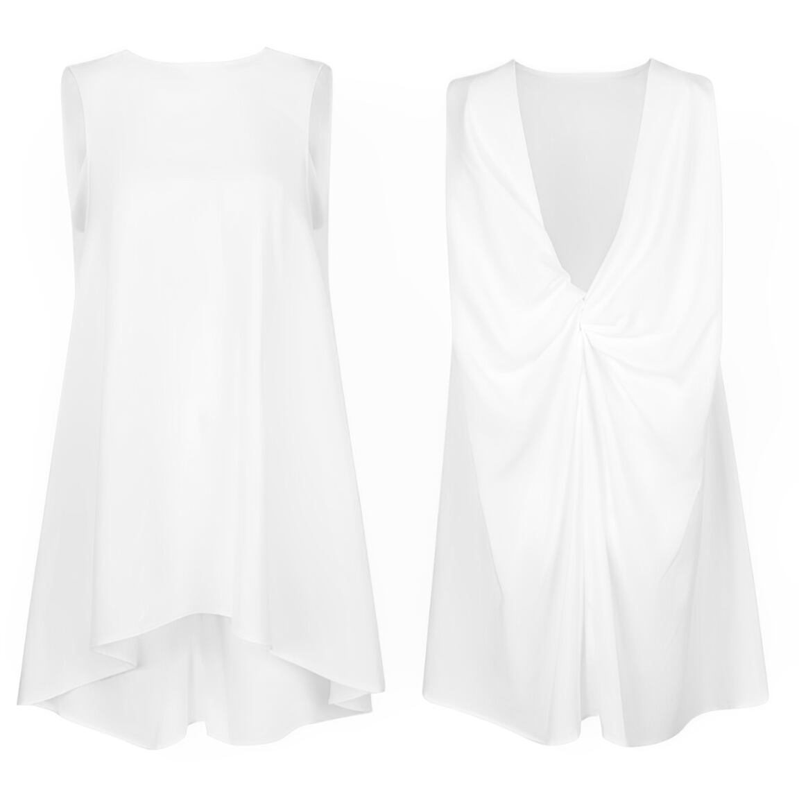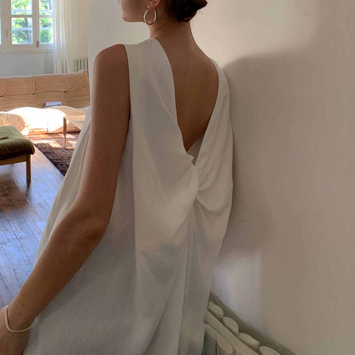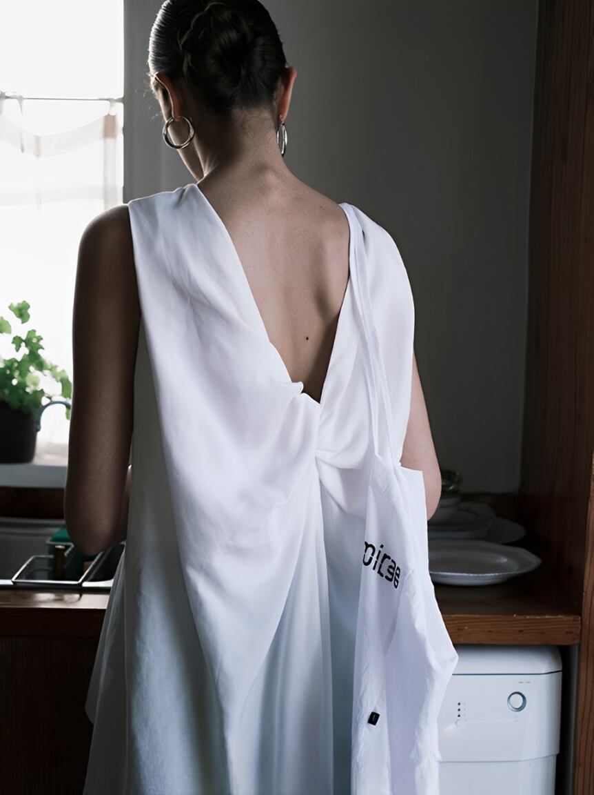 後ろでタイを結んで着るスリーブレストップスが登場しました。ラウンドネックで華奢な肩紐が女性らしい印象を演出し、後ろ姿もおしゃれに引き立ちます。
