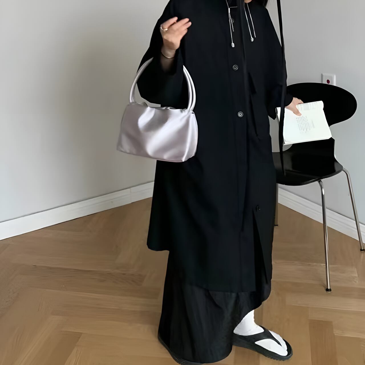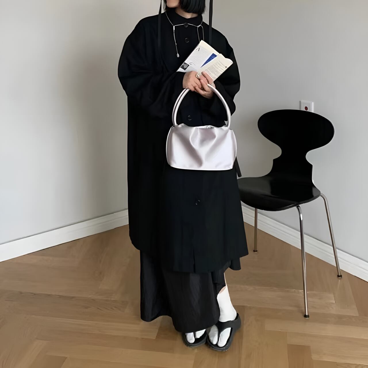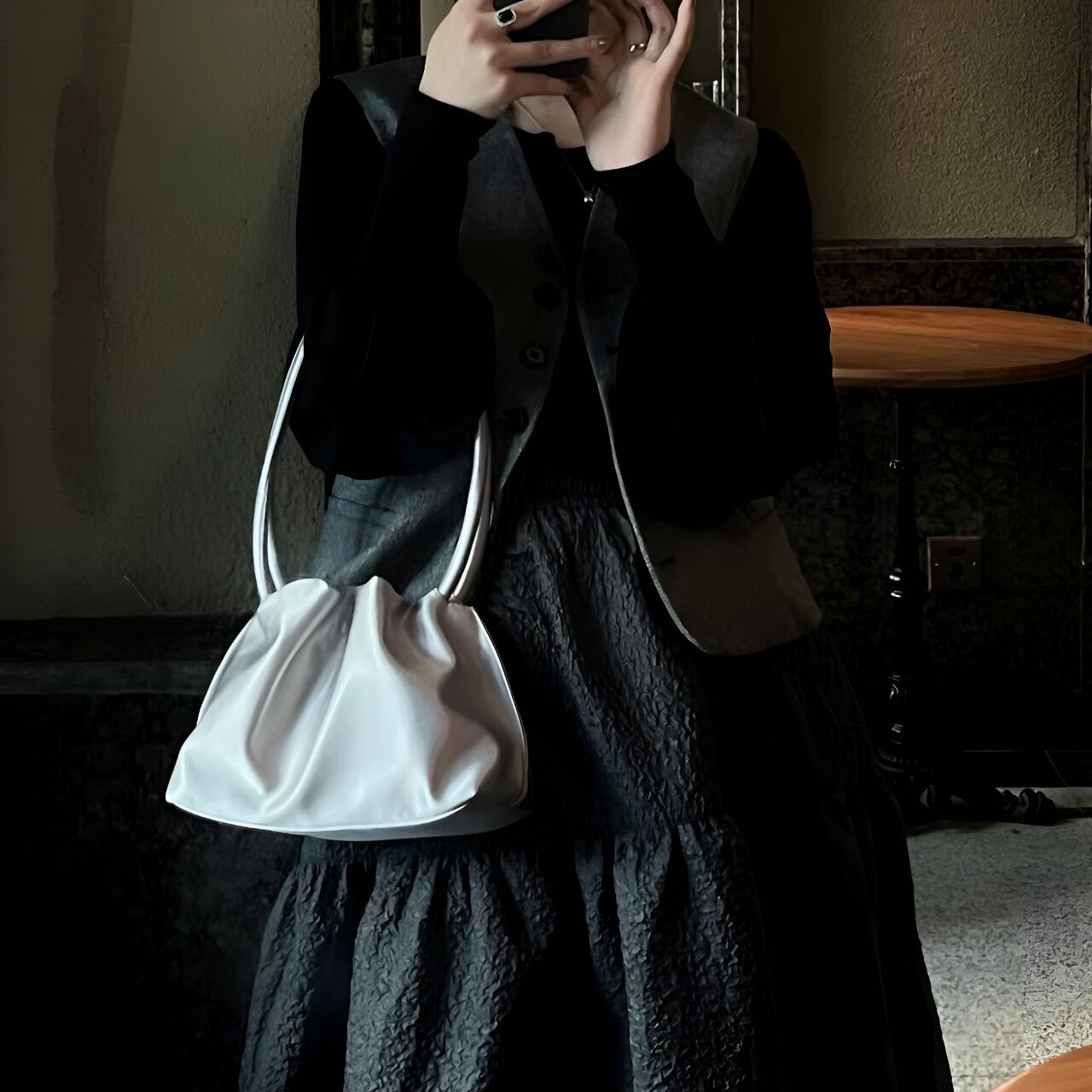 シンプルで洗練されたデザインが特徴のショルダーバッグです。シルバーのメタリックカラーが上品な印象を与え、どんなスタイルにもマッチする万能アイテムです。