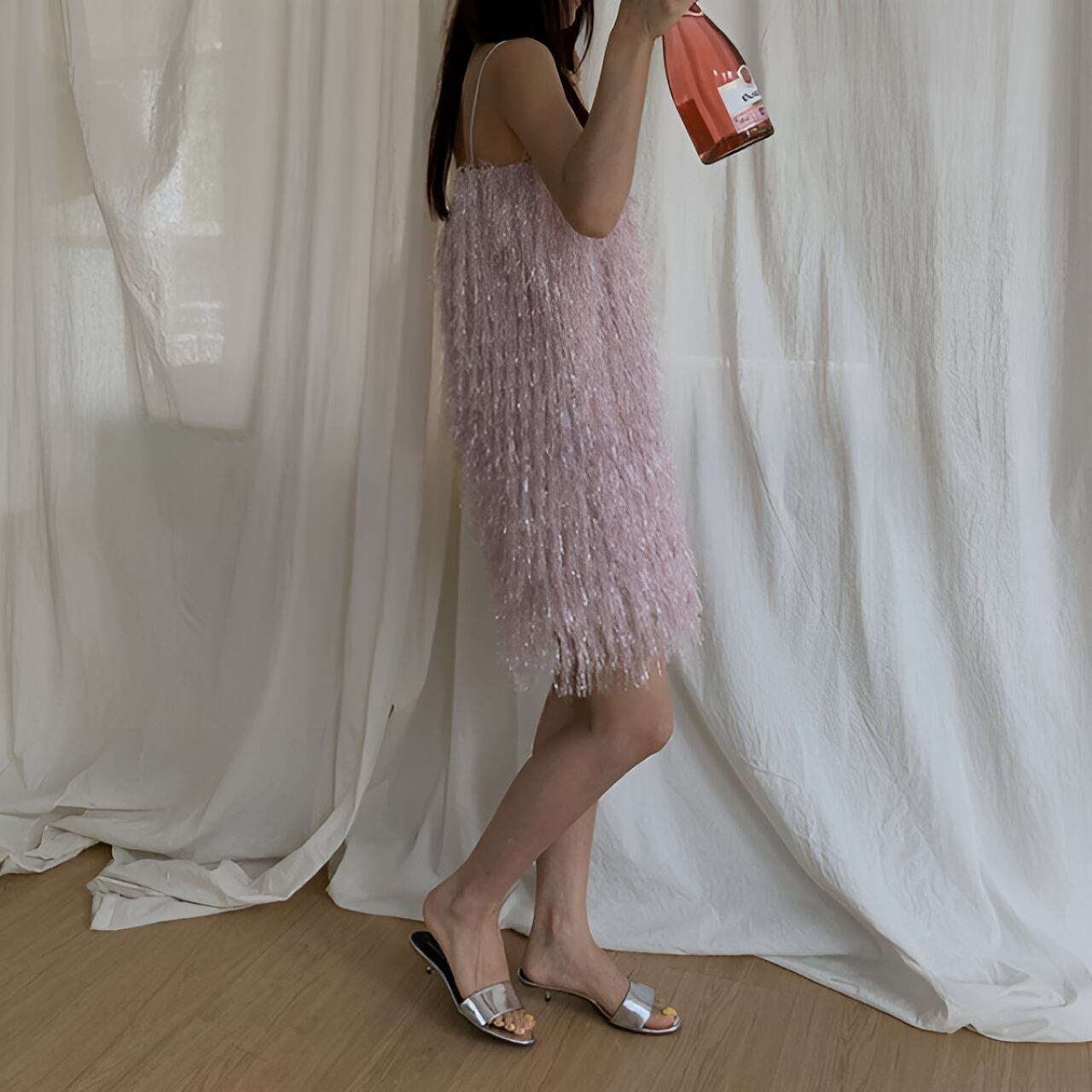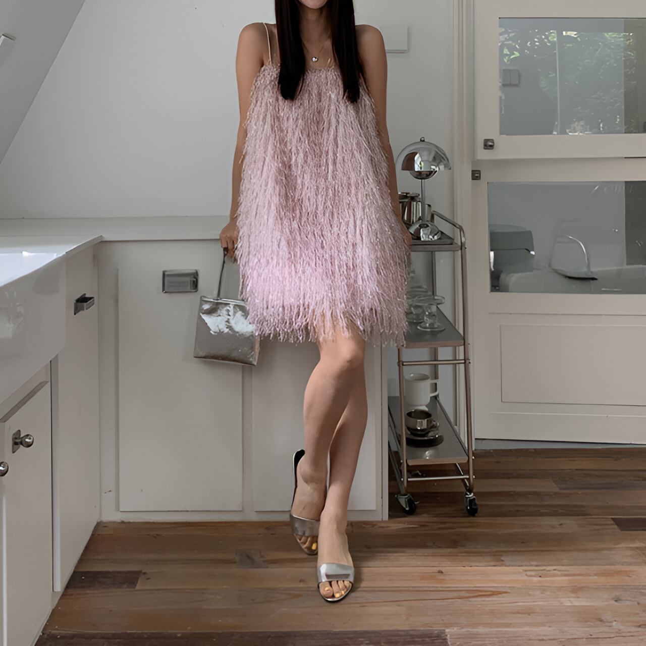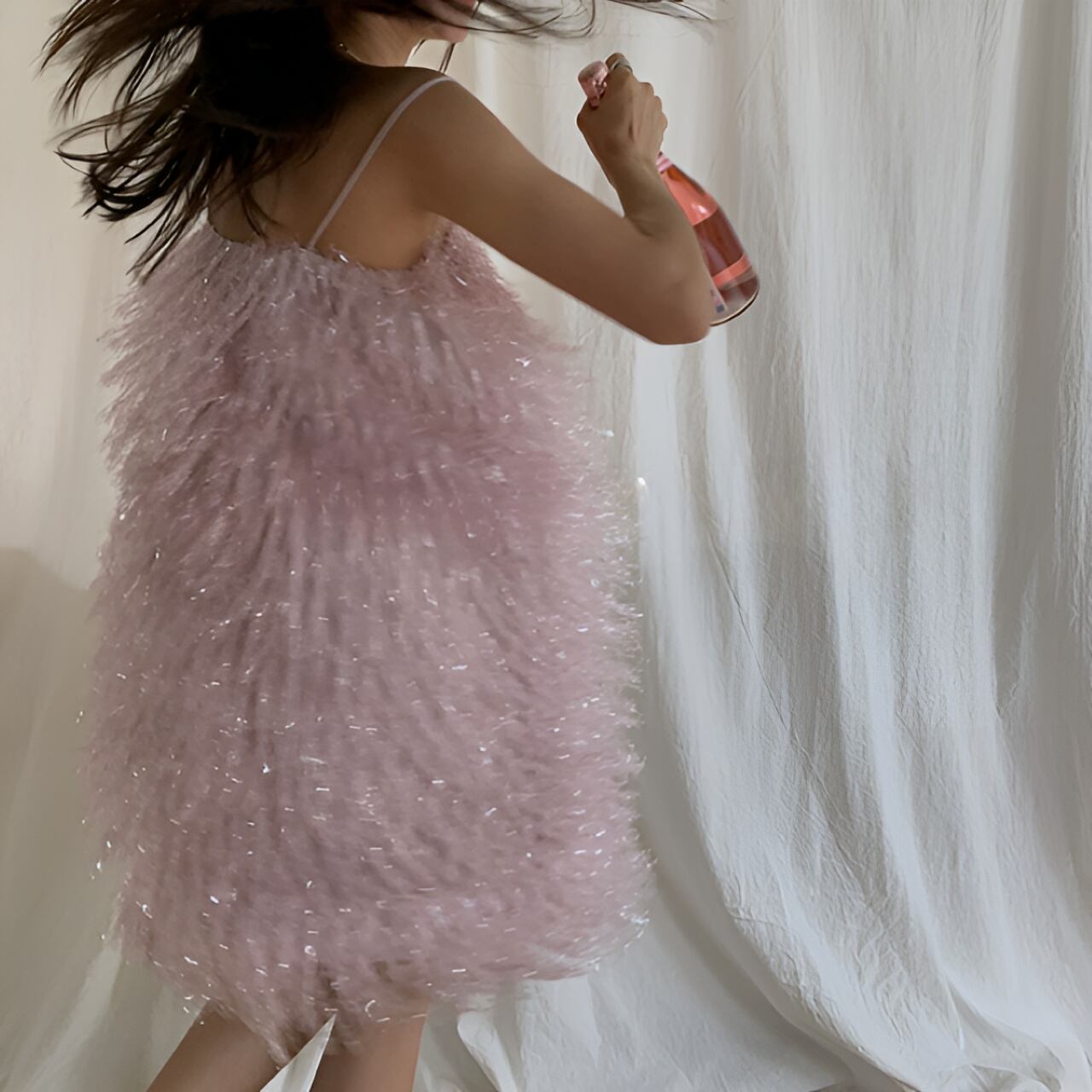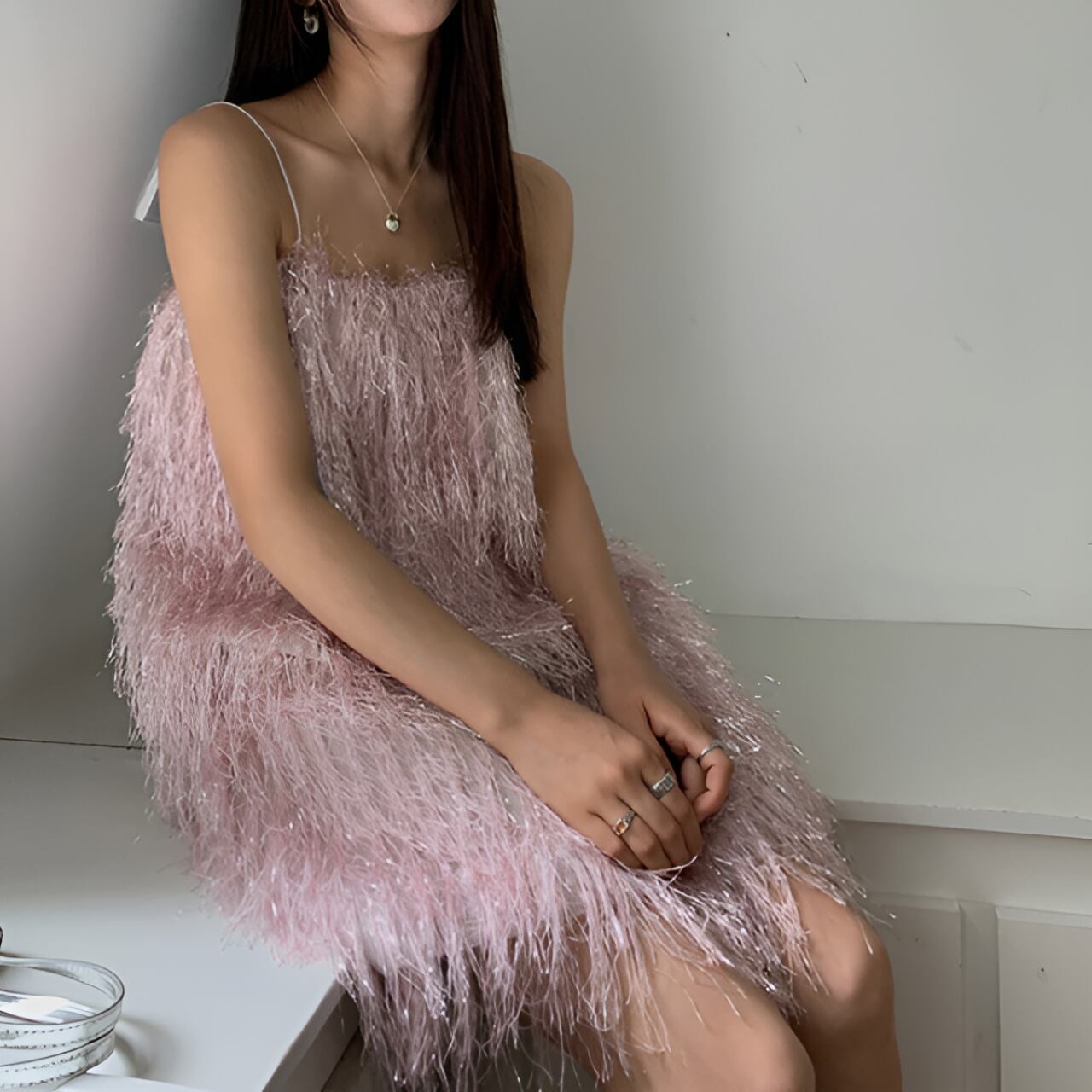 一枚で存在感のあるファッションを演出してくれるアイテムです。ピンク色のドレスには上品なタッセルが施されており、華やかさを演出しています。ボヘミアンスタイルやパーティーシーンにもぴったりの一着です。