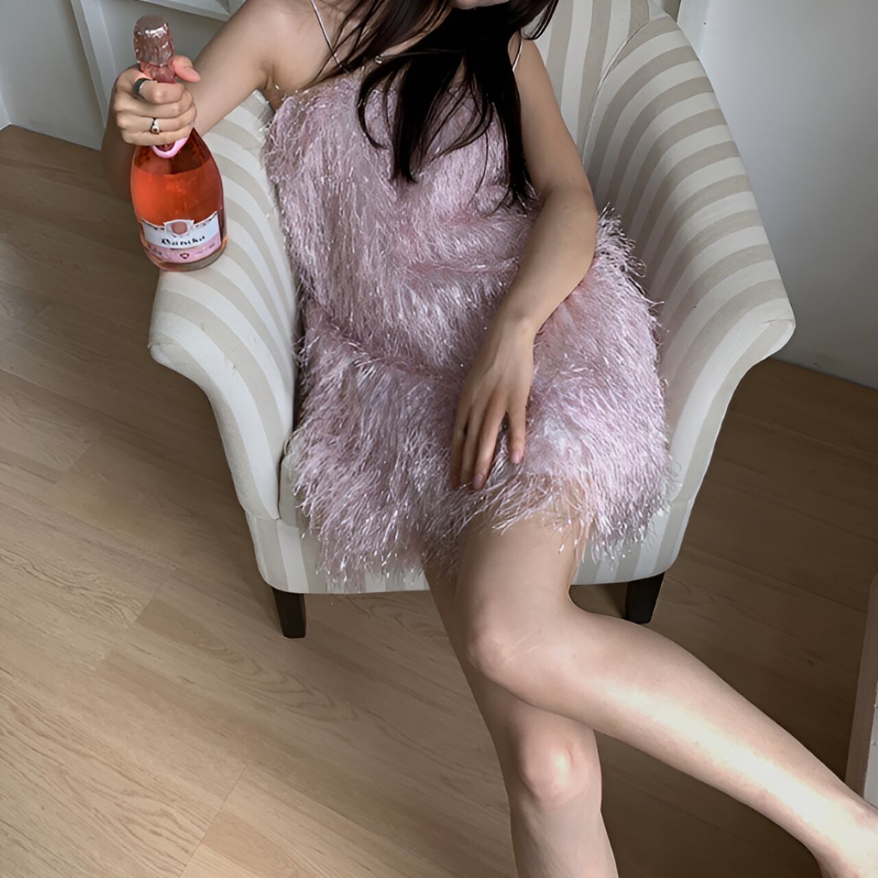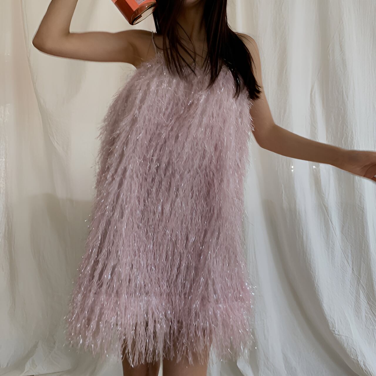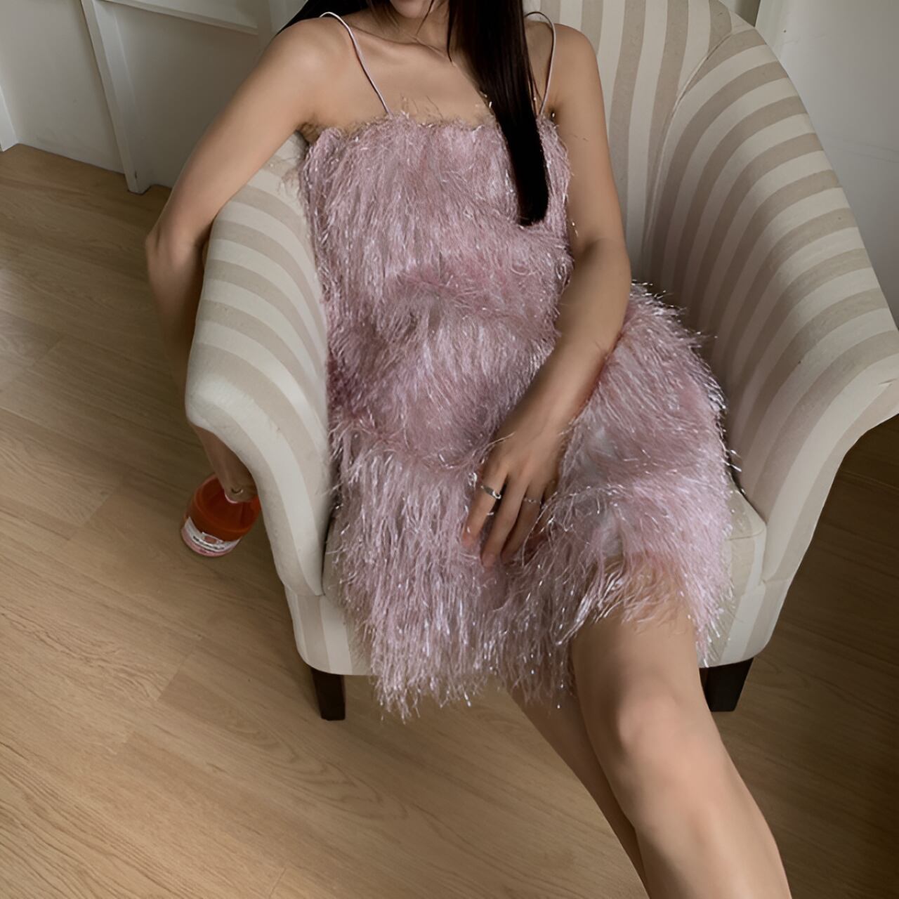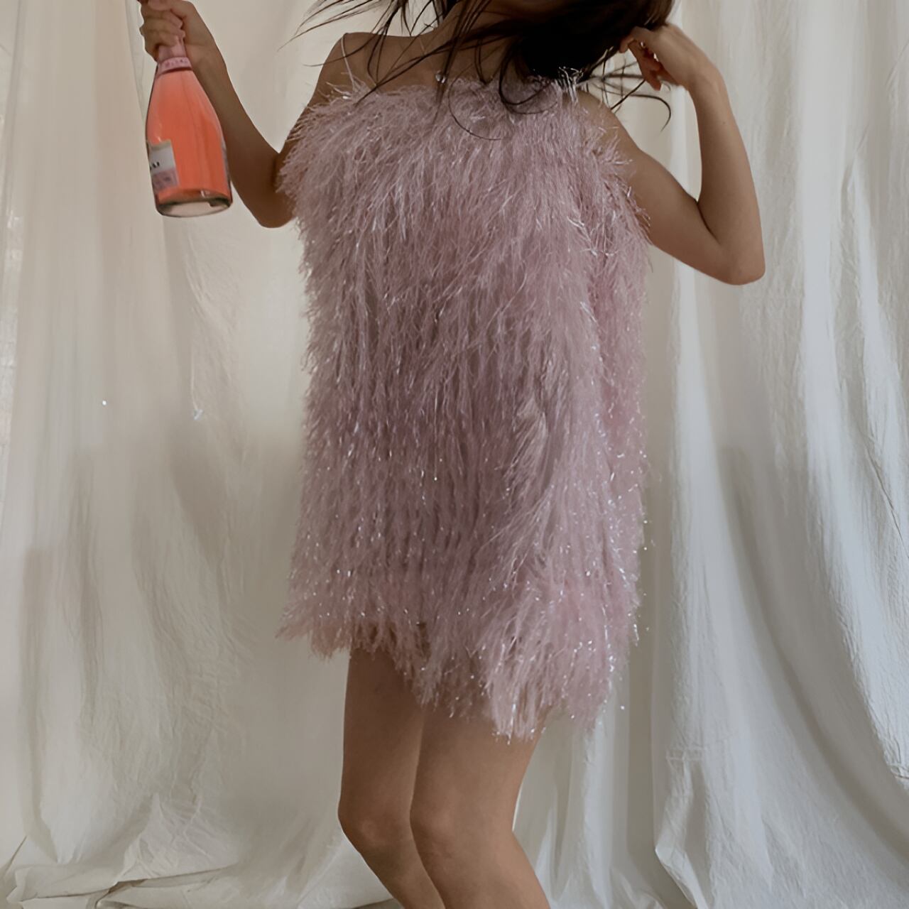 一枚で存在感のあるファッションを演出してくれるアイテムです。ピンク色のドレスには上品なタッセルが施されており、華やかさを演出しています。ボヘミアンスタイルやパーティーシーンにもぴったりの一着です。