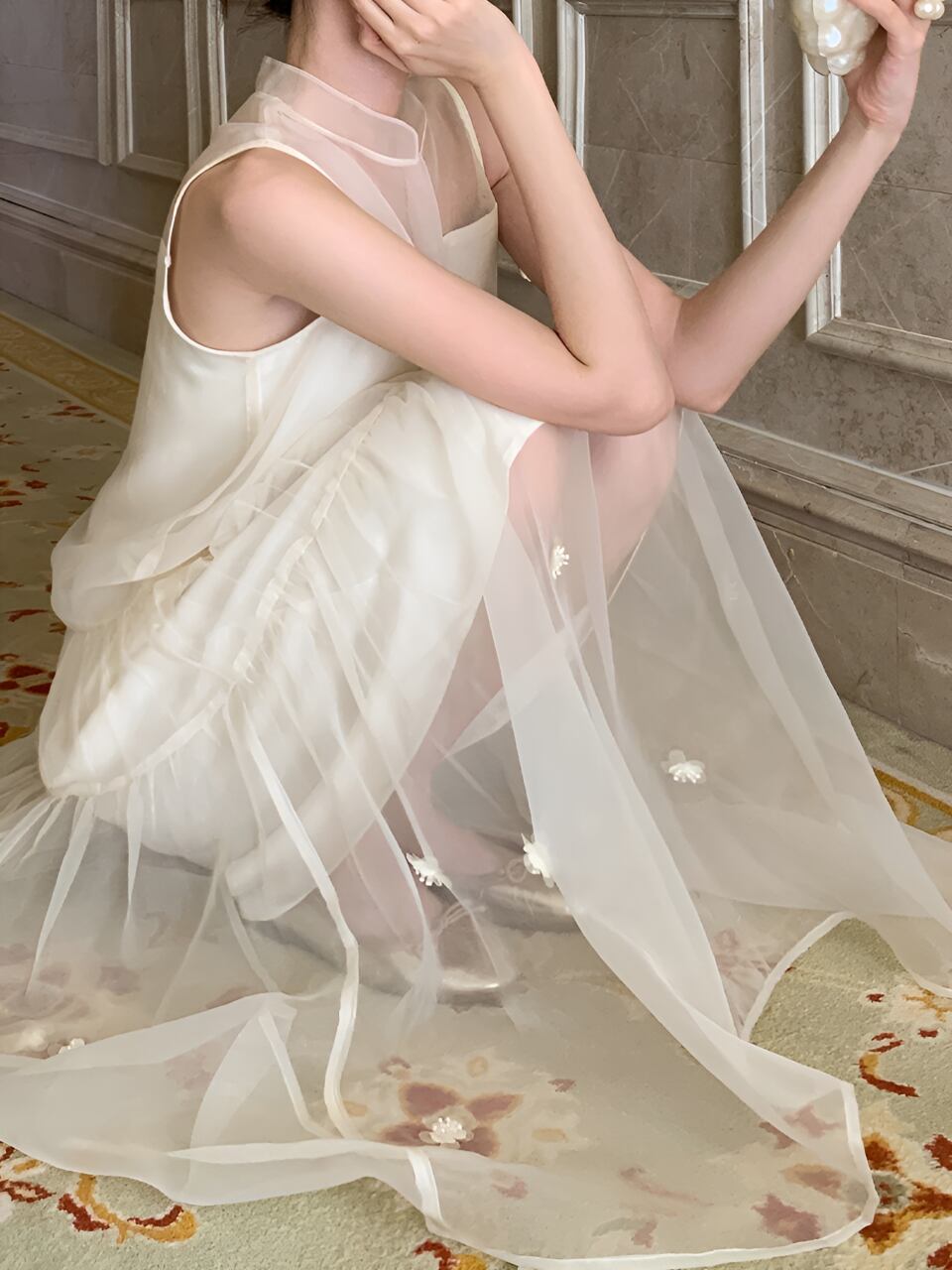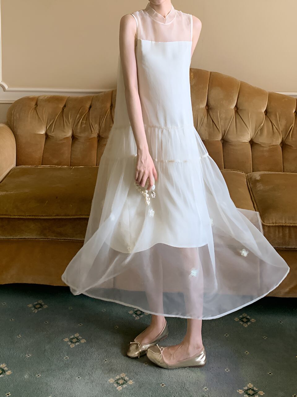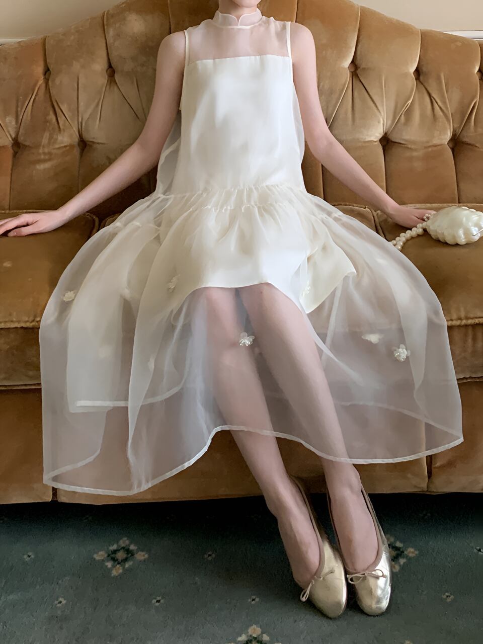 透け感のある素材が女性らしさを引き立てる一着。フェアリーのような優美さを演出し、あなたをドレスアップさせてくれます。軽やかな着心地で、夢のような空間に誘ってくれること間違いなし。