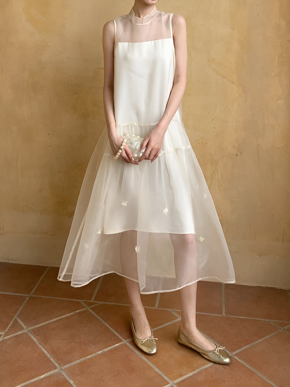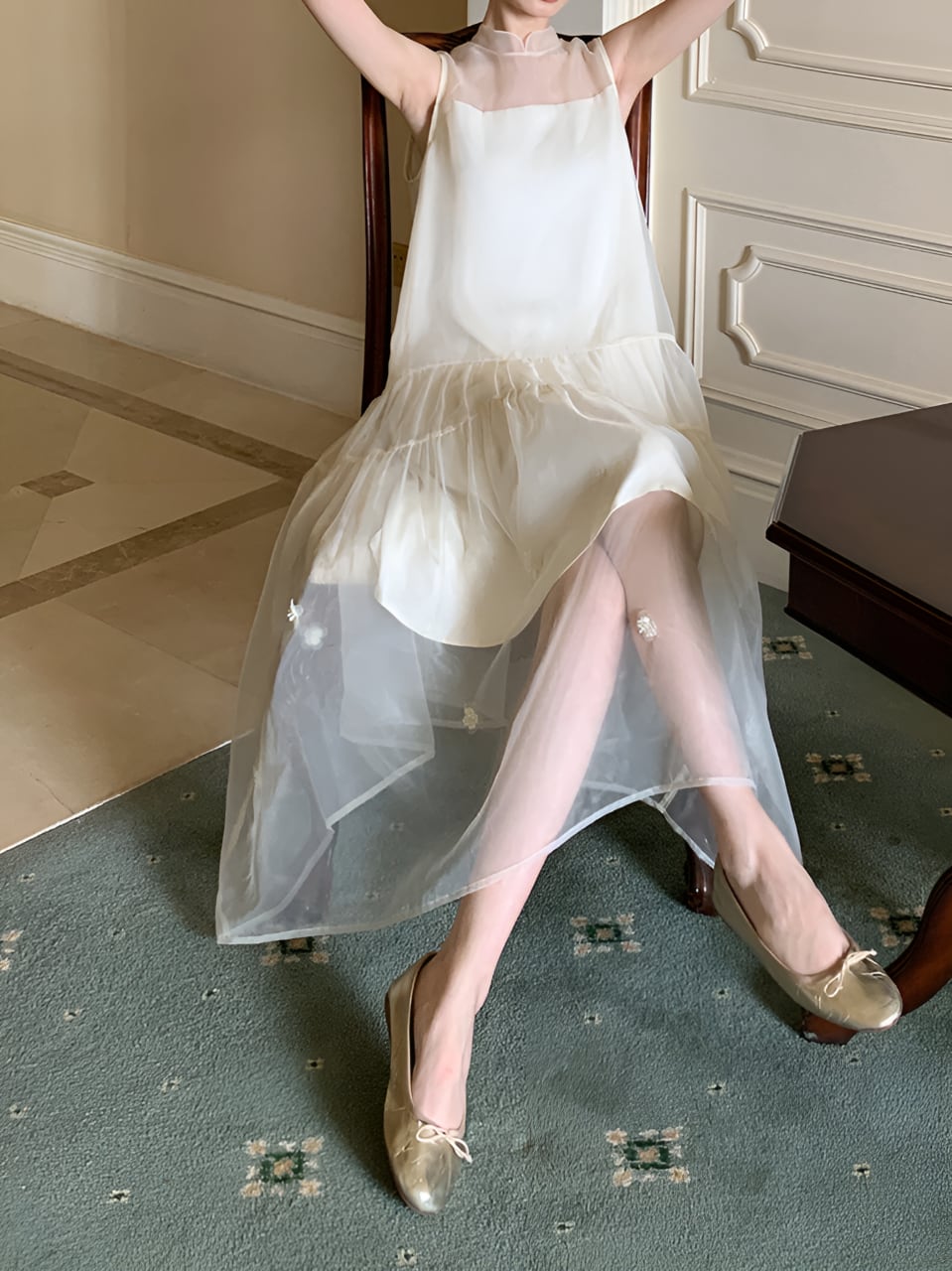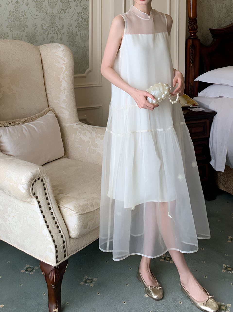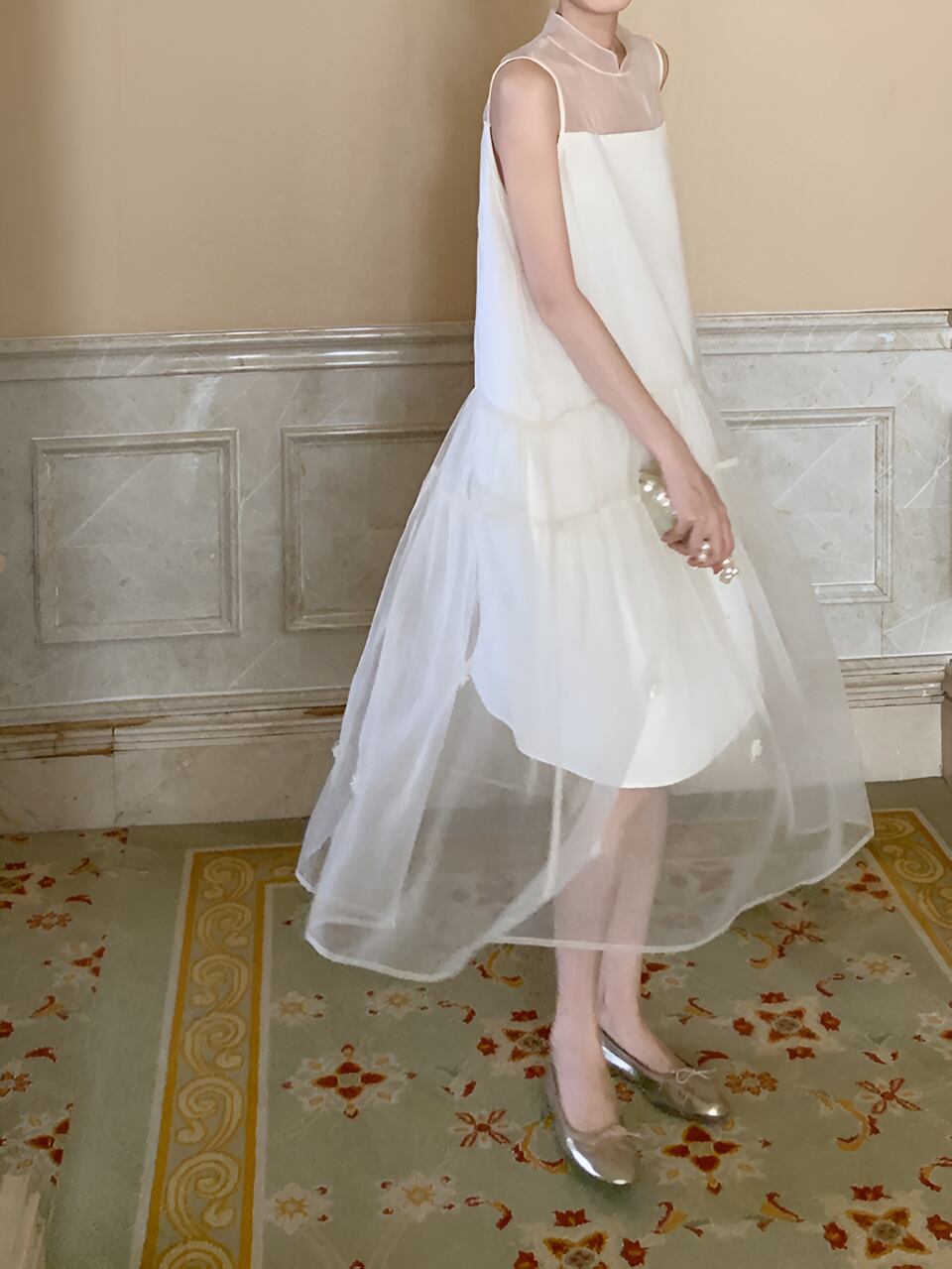 透け感のある素材が女性らしさを引き立てる一着。フェアリーのような優美さを演出し、あなたをドレスアップさせてくれます。軽やかな着心地で、夢のような空間に誘ってくれること間違いなし。